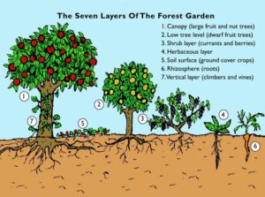 Theo Robert Hart, dựa trên sự quan sát có hệ thống từ rừng tự nhiên và tự tạo dựng cho mình, vườn rừng sẽ có 7 tầng tán khác nhau bằng các phương pháp trồng xem canh.